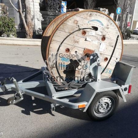 Chargement de touret sur portique inclinable à l’aide d’un treuil manuel assisté par vérins à gaz.